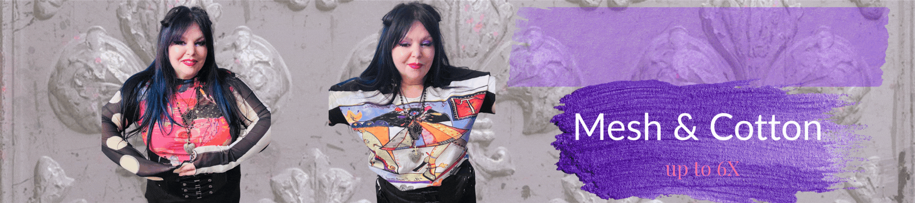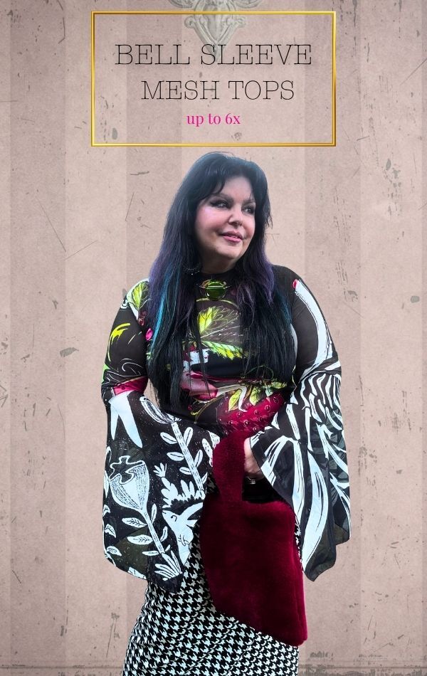 Our most popular cat woman image now on a bell sleeve top! The dramatic painted cat woman fills the fabric with black stripes against white. The super wide bat sleeves finish the look...