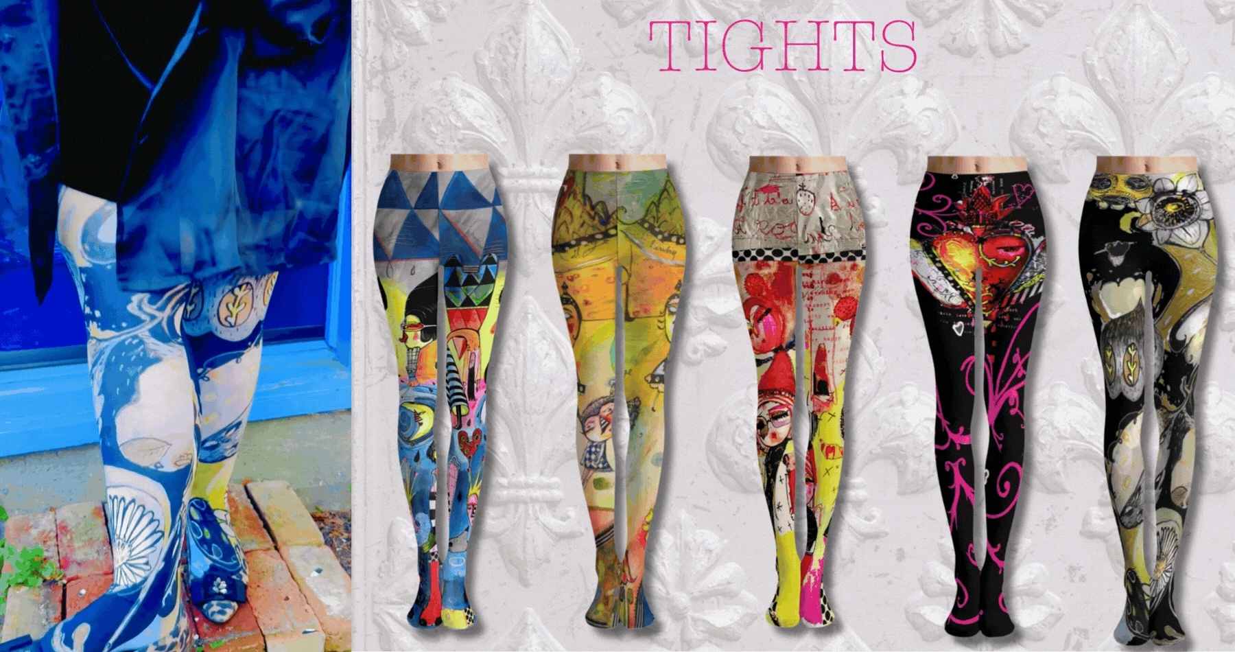 Gorgeous hand painted sketches of shoes and illuminated letters fill these modern tights in black, gold, parchment yellows, deep reds and cobalt. The artist sketch really gives an unusual look...