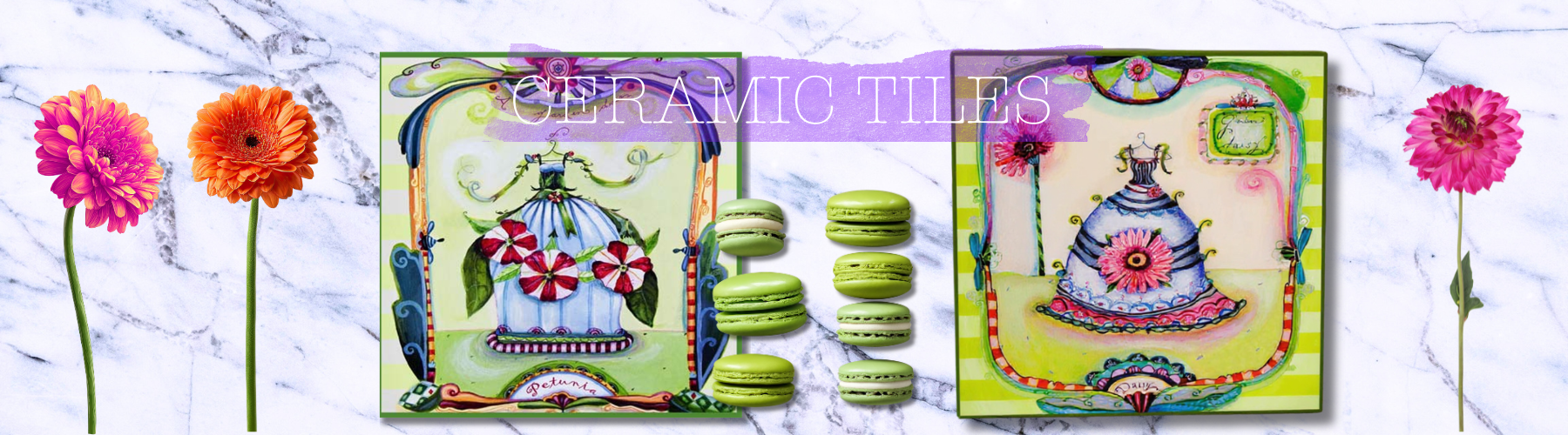 Heat safe ceramic tile trivets feature the art of Wendy Costa in three sizes