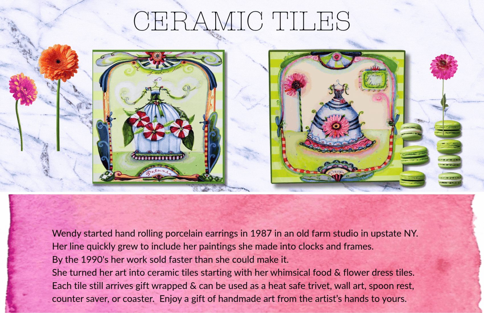 This extraordinary line of illustrations created by Wendy Costa are glazed into glossy, white ceramic tile. Each tile is completely heat safe and suitable for bringing hot plates to the table. Each tile ships with counter pads and wall hanger. Enjoy...